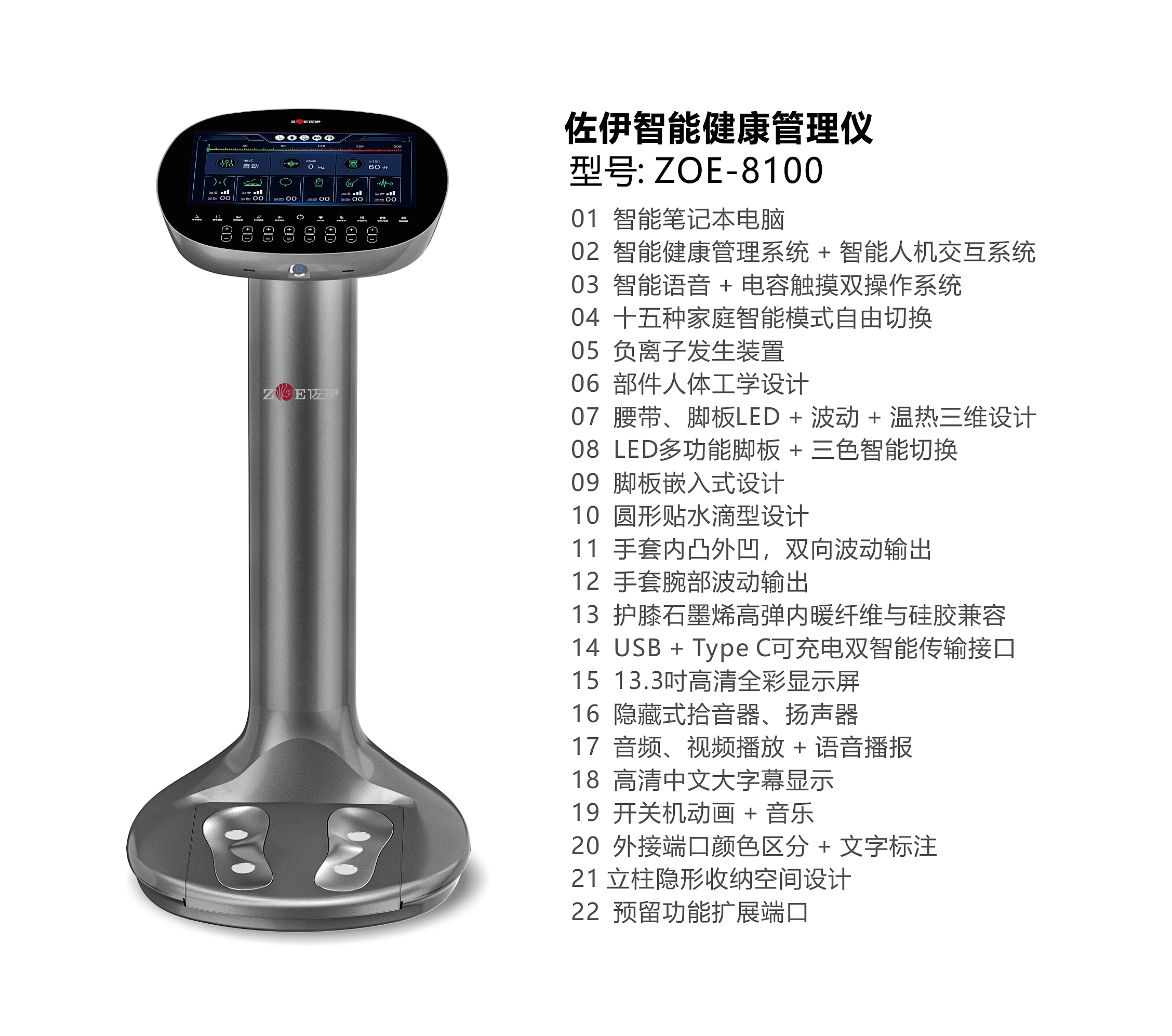 佐伊智能健康管理仪利用低频波动、红外温热、LED光学、负氧离子等国际医学前沿技术,通过特殊设计的多种部件对人体全身各部位进行经穴刺激,促进人体肌肉运动,快速分解人体内多余的脂肪,疏通气血运行,排出垃圾毒素,重塑人体的内、外环境,实现美体塑形和健康管理的双重目标。产品搭载智能人机交互和智能健康管理两大系统,所有功能语音/触控一键实现,界面亲和、部件多样、覆盖全身、效果显著、操作简单。