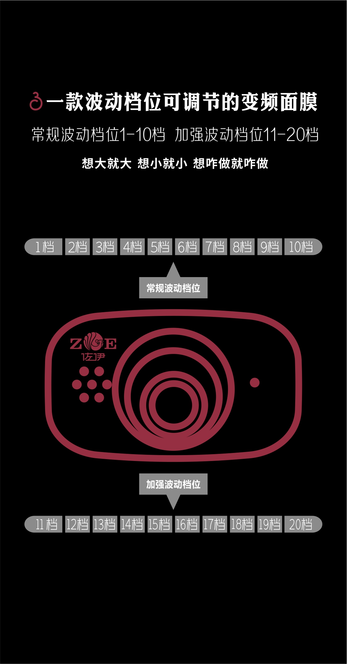 20档精细波动强度:常规的1-10档适合日常舒缓保养;加强的11-20档,则可应对特别疲劳时的深度放松或紧致需求。3大专业波动模式,一键切换: