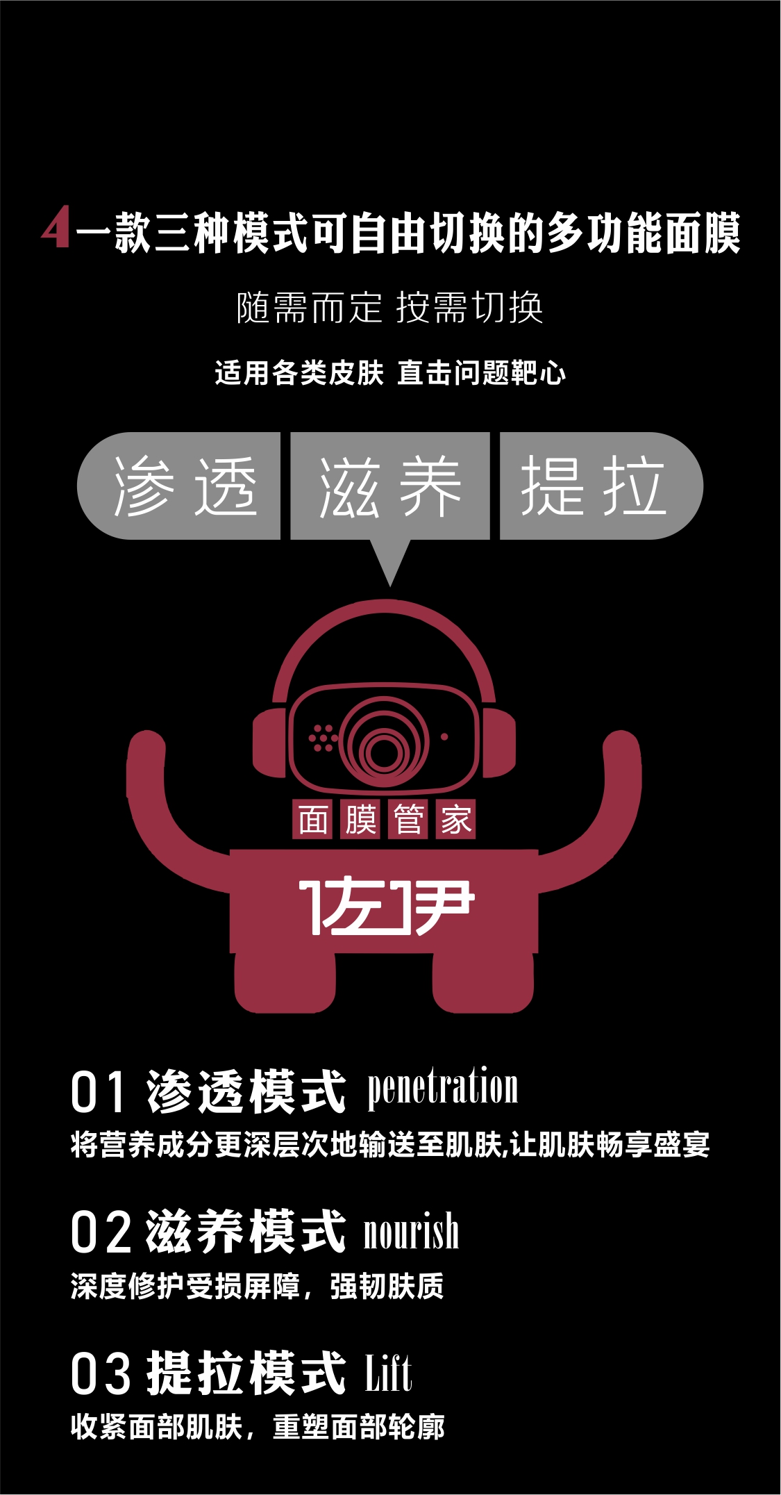 渗透模式:助力打开营养通道,将面膜精华更深层输送,让肌肤畅饮一场养分盛宴。