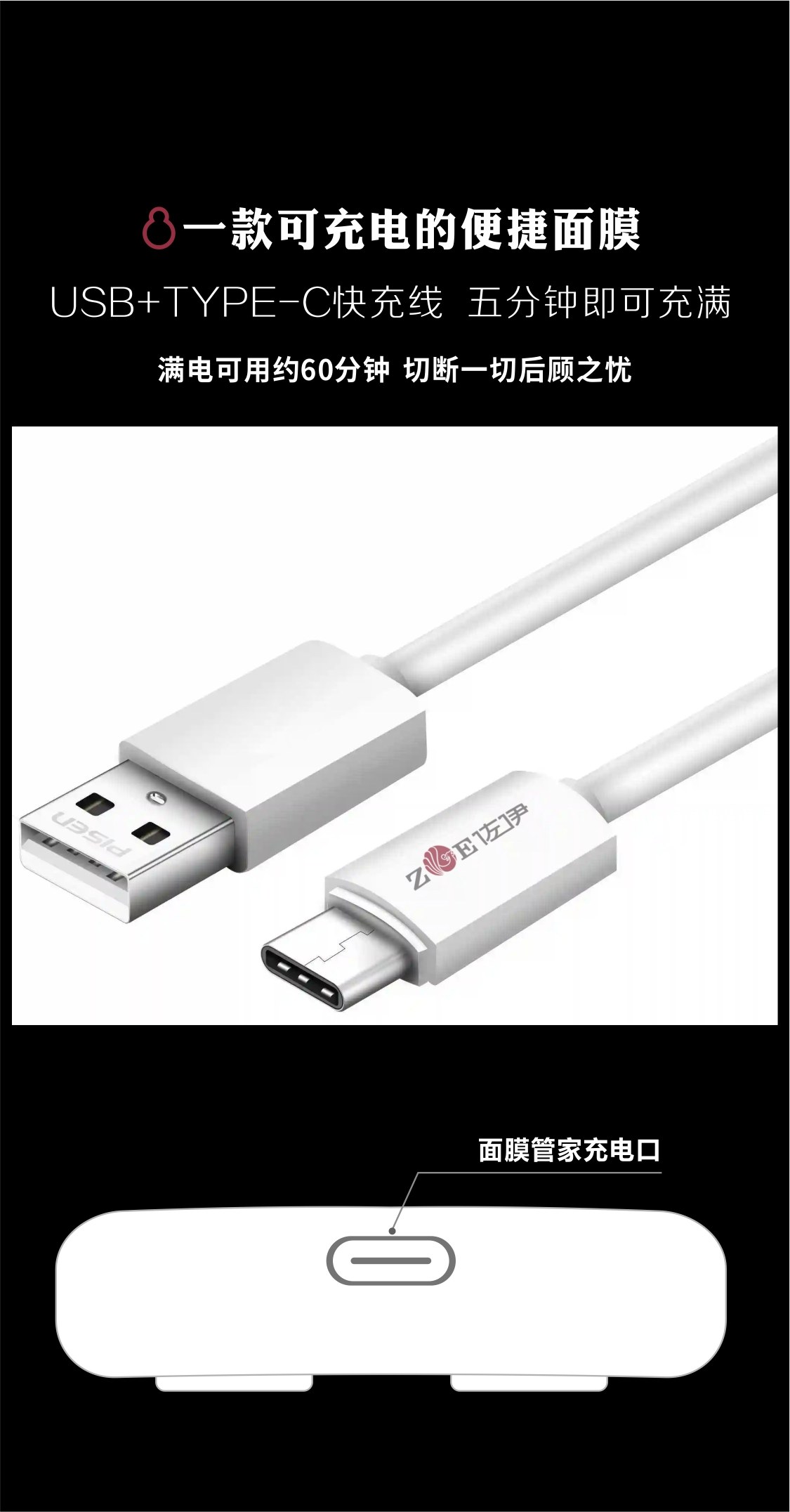 你是否担心面膜管家用到一半就没电?不必焦虑,我们已终结了这种后顾之忧。产品支持USB/Type-C双接口快充,仅需5分钟即可快速充满,满电状态下可持续使用约60分钟,足以完成数次完整的护理疗程。便捷充电设计,让你随需随用,护肤体验永不中断。